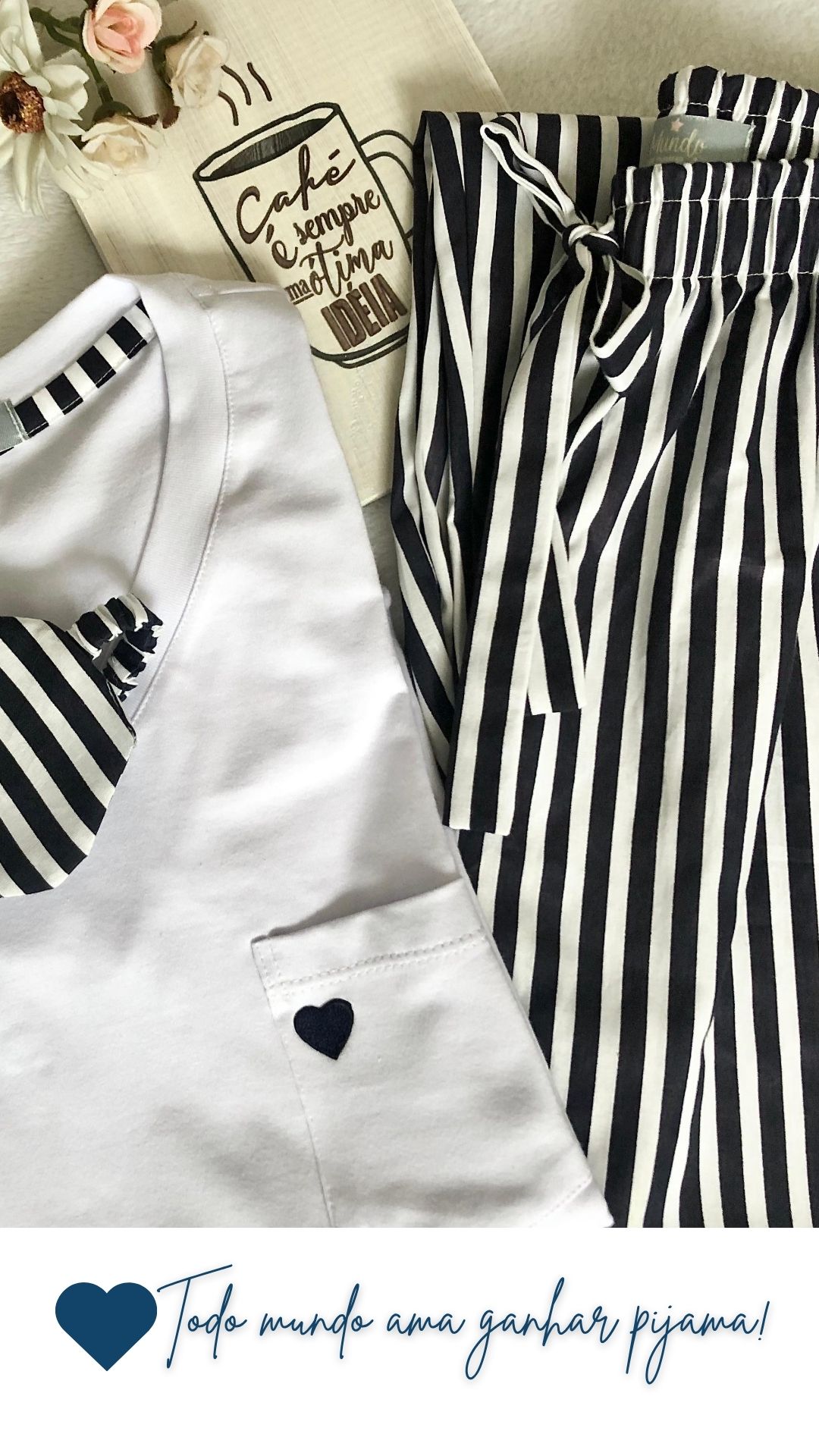 A calça em tricoline 100% algodão listrada marinho noite tem bolsos e modelagem perfeita, pode ser usada tranquilamente pra sair, permitindo montar diversos looks que vão além do pijama!