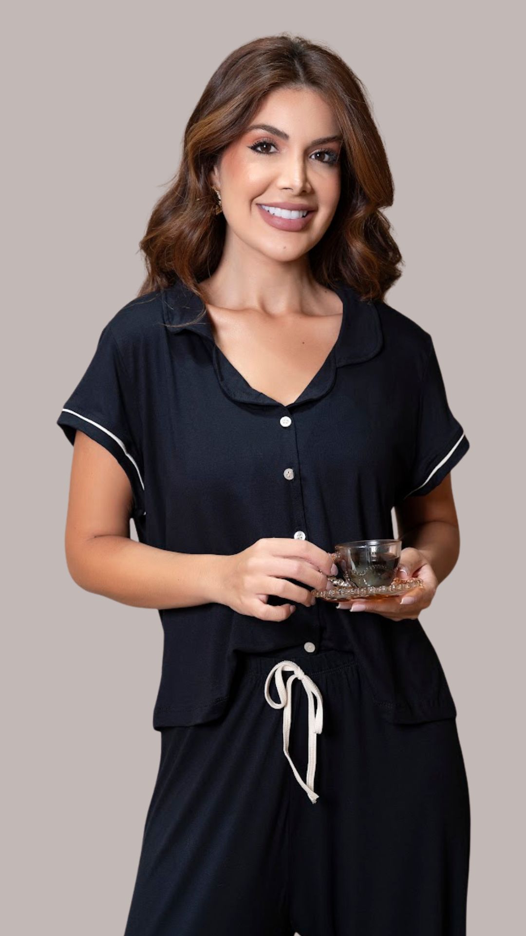 Preto com Bege- Pijama Americano Longo Pantalona