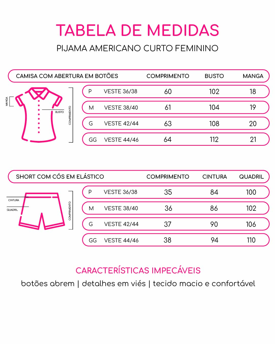 Tecido Viscolycra (96% Viscose, 4% Elastano), durável e sem necessidade de passar.